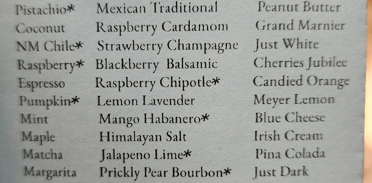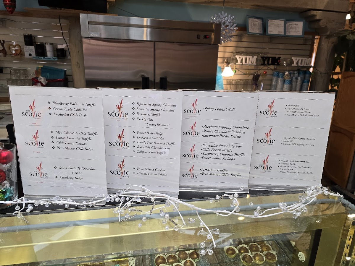 Sweet Santa Fe LLC offers a delightful array of treats and savory options that cater to a variety of tastes. For those with a sweet tooth, the menu boasts a selection of award-winning truffles, including the Pistachio Chocolate Truffle, Mango Habanero Chocolate Truffle (2020 Scovie Award Winner), and the Pumpkin Chocolate Truffle (2020 Scovie Award Winner). If you prefer fudge, their options such as Just Chocolate Fudge and NM Chile Chocolate Fudge provide indulgent choices. The Chipotle Chile Sipping Chocolate Mix has even earned two 2020 Scovie Awards! For a crunchy snack, the NM Chile Caramel Corn (1st place 2020 Scovie Award Winner) and Lavender Pecan Caramel Corn (2020 Scovie Award Winner) are standouts.